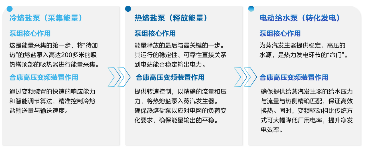 作為該項目的全生命周期價值伙伴,合康新能提供了涵蓋熱熔鹽泵、冷熔鹽泵及電動給水泵在內(nèi)的多套HC1000高壓變頻解決方案,為這一國家示范項目保駕護航。